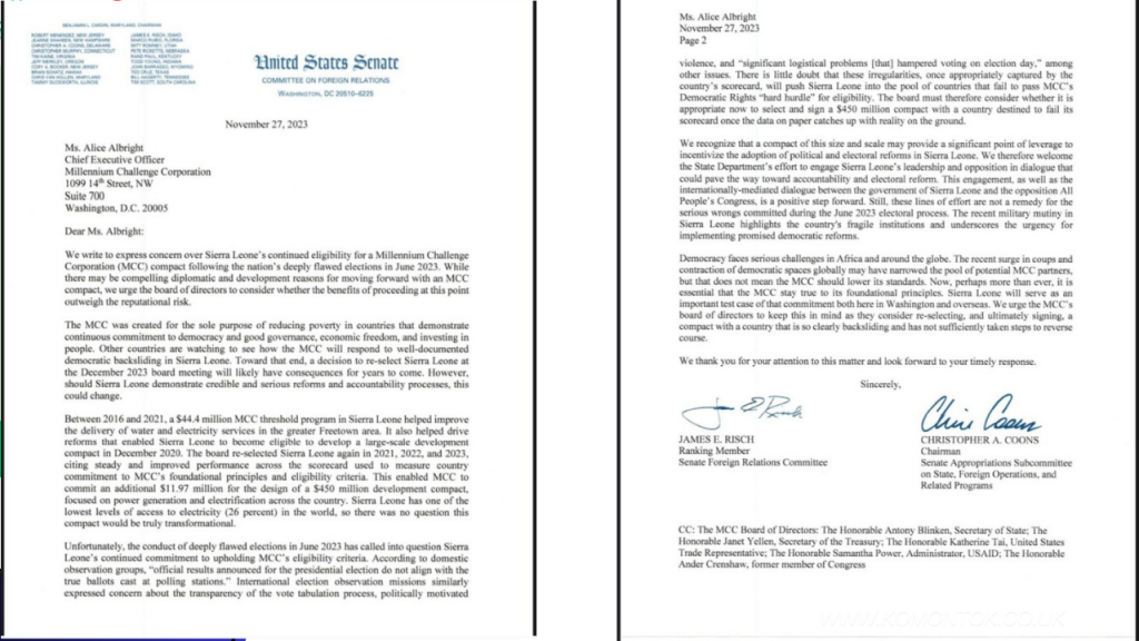 The US government’s decision to even consider Sierra Leone’s eligibility for Compact Funding under President Julius Maada Bio has deeply troubled the country, according to a damning letter sent to the Board of the US Millennium Challenge Corporation by Ranking Member James E. Risch and Chairman Christopher Coons, two senior members of the US Senate Committee on Foreign Relations.